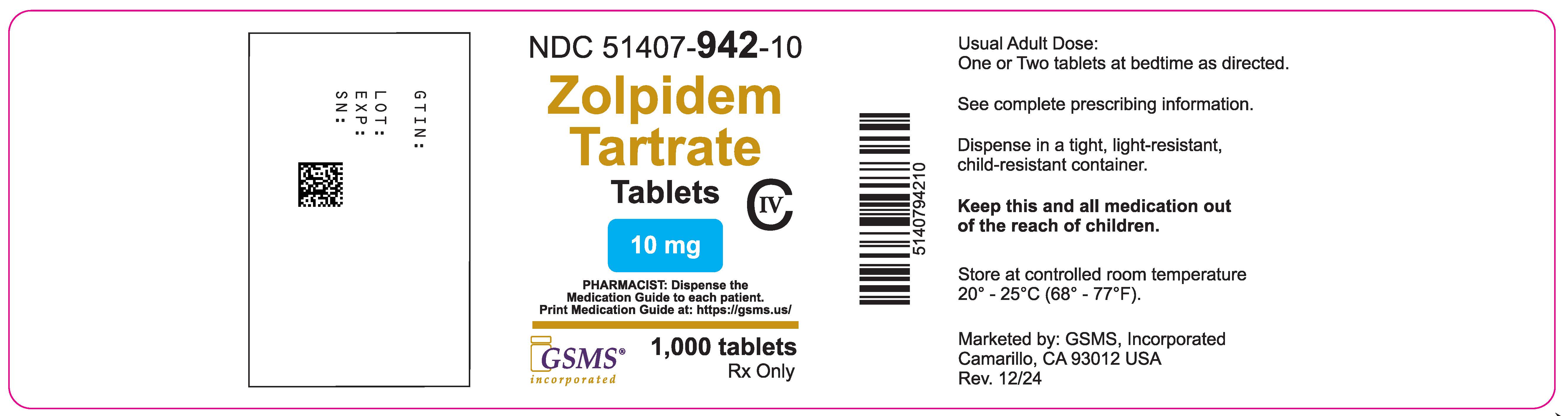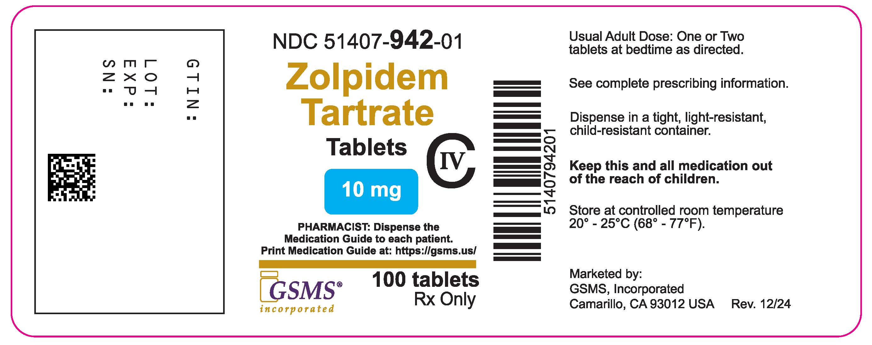 Description: This is a medication label for Zolpidem Tartrate tablets with the NDC number 51407-942-10. It provides instructions for the pharmacist to dispense the Medication Guide to each patient and includes the usual adult dose of one or two tablets at bedtime. The label also specifies to dispense in a tight, light-resistant, child-resistant container and to store at controlled room temperature. The medication is distributed by GSMS, Incorporated in Camarillo, California, USA.*