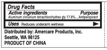 This is a drug fact label for a product distributed by Amercare Products, Inc. The active ingredient is listed as "A e ey g 178%..Anlrapan" and the product is labeled as being from China.*