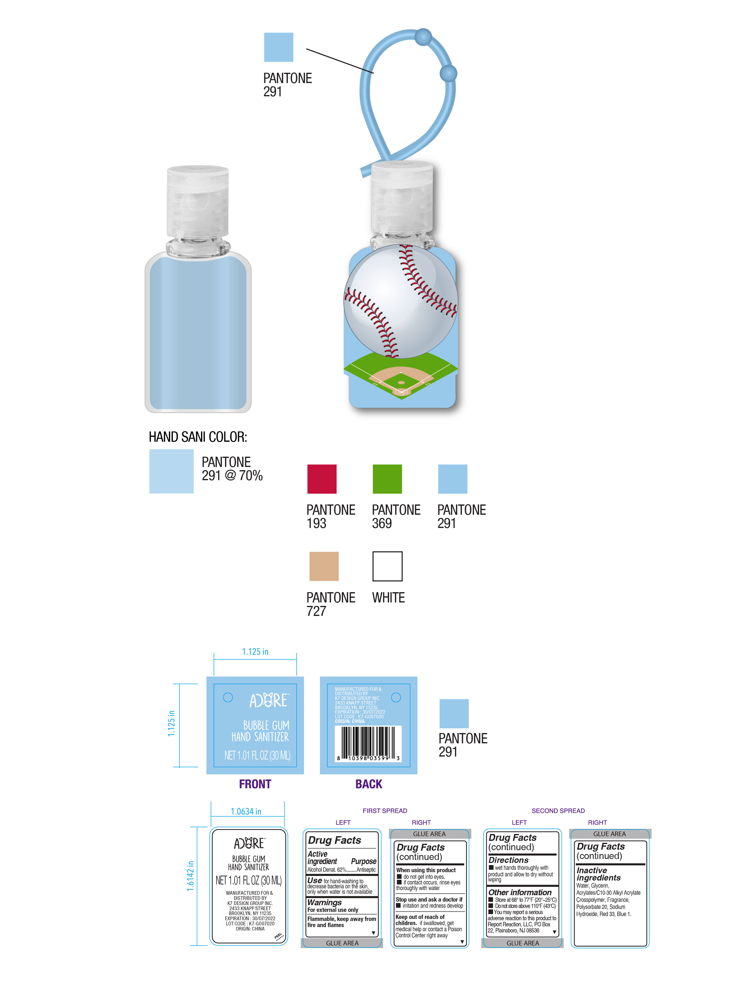 This text appears to be the label of a hand sanitizer bottle. The label includes important information such as the name of the product, the active ingredient (Alcohol Denat. 62%) and its purpose (Antiseptic). It also provides instructions for use, warnings, and inactive ingredients such as water, glycerin, and fragrance. The product was manufactured for and distributed by K7 Design Group Inc. located in Brooklyn, NY, and it was made in China. It also contains a Pantone color code (291) and expiration date (30/07/2022). *