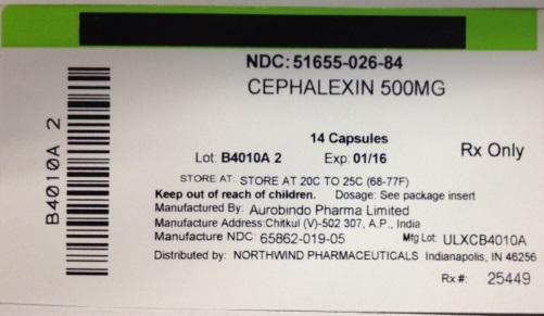 CEPHALEXIN 500MG is a medication containing 14 capsules. It is manufactured by Aurobindo Pharma Limited and distributed by NORTHWIND PHARMACEUTICALS, based in Indianapolis. The Lot number is B40TOAZ with expiry date 0116, and NDC code is 51655-026-84. It should be stored at a temperature between 20C and 25C and kept out of reach of children. Dosage information can be found in the package insert.*