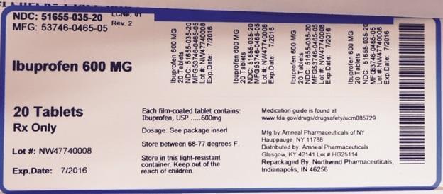 The following 3 images provide visual information about the product associated with Ibuprofen NDC 51655-035 by Northwind Pharmaceuticals, Llc, such as packaging, labeling, and the appearance of the drug itself. This resource could be helpful for medical professionals, pharmacists, and patients seeking to verify medication information and ensure they have the correct product.