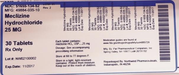 The following image provide visual information about the product associated with Meclizine Hydrochloride NDC 51655-134 by Northwind Pharmaceuticals, Llc, such as packaging, labeling, and the appearance of the drug itself. This resource could be helpful for medical professionals, pharmacists, and patients seeking to verify medication information and ensure they have the correct product.