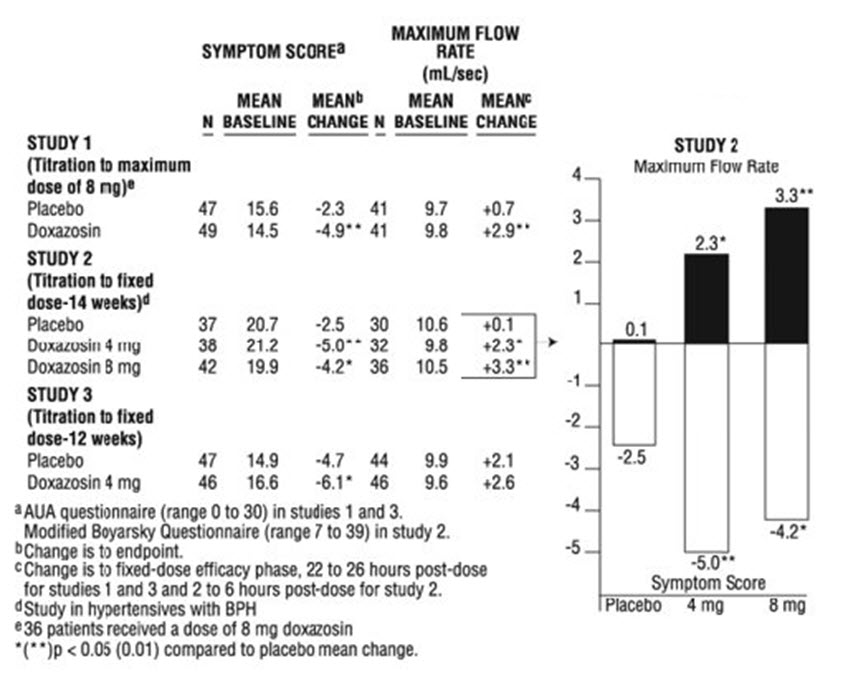 The results from the three placebo-controlled studies (N = 609) showing significant efficacy with 4 mg and 8 mg doxazosin are summarized in Table 3. In all three studies, doxazosin resulted in statistically significant relief of obstructive and irritative symptoms compared to placebo. Statistically significant improvements of 2.3 mL/sec to 3.3 mL/sec in maximum flow rate were seen with doxazosin in Studies 1 and 2, compared to 0.1 mL/sec to 0.7 mL/sec with placebo.