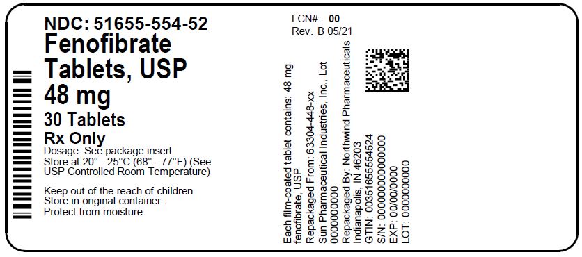 This is a description of Fenofibrate tablets, USP with NDC code 51655-554-52 containing 48 mg of the active ingredient. The tablets come in a bottle containing 30 tablets, with dosage and storage instructions provided in the package insert. The tablets should be stored at controlled room temperature and protected from moisture. The product was repackaged by Northwind Pharmaceuticals from Lot 63304-448-xx manufactured by Sun Pharmaceutical Industries, Inc. The other details include LCN number, GTIN number, serial number, expiration date, and lot number.*