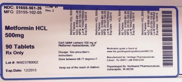 This is a description for Metformin HCL 500mg tablets with a NDC code of 51655-561-26 and a MFG code of 23155-102-05. The tablets are packed in a bottle of 90 tablets and are only available with a prescription. The suggested dosage should be determined by the prescriber. The tablets should be stored at a temperature between 68.77 degrees F and should be kept away from children. The lot number is NW23780002 and the expiration date is 12/2015. The repackaging was done by Northwind Pharmaceuticals in Indiana, with a zip code of 48256.*