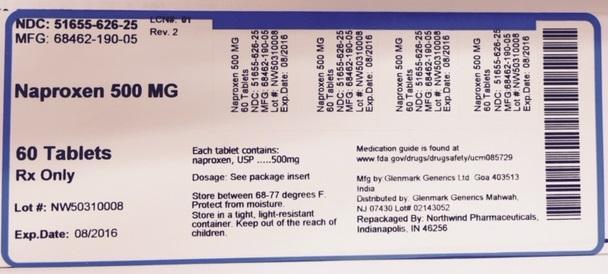 The following 4 images provide visual information about the product associated with Naproxen NDC 51655-626 by Northwind Pharmaceuticals, Llc, such as packaging, labeling, and the appearance of the drug itself. This resource could be helpful for medical professionals, pharmacists, and patients seeking to verify medication information and ensure they have the correct product.