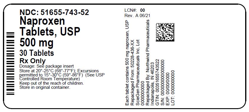 This is a description of a bottle of Naproxen USP tablets containing 30 tablets, each tablet having a strength of 500mg. The NDC number for the bottle is 51655-743-52. The tablets are prescription-only medicine and should be stored between 20-25 °C. The bottle should be kept away from children and stored in its original container. The manufacturer of this repackaged product is Northwind Pharmaceuticals and it was repackaged from the original product with NDC number 50228-436-XX. The lot number for this product is 0000000000 and its expiration date is 00/00/0000.*