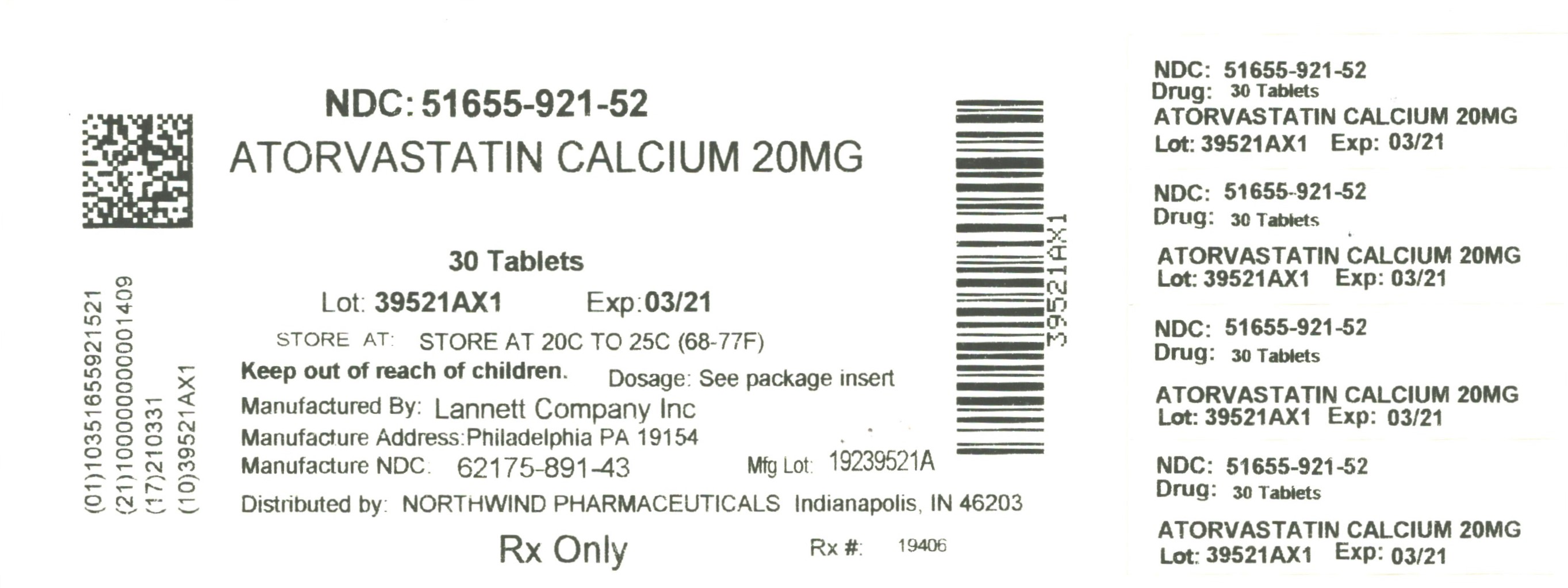 This is a description of a drug, Atorvastatin Calcium 20mg, containing 30 tablets, with the NDC number 51655-921-52, lot number 39521AX1, and the expiration date of 03/21. It's manufactured by Annnet Company Inc in Philadelphia and distributed by Northwind Pharmaceuticals in Indianapolis. It should be stored at 20C to 25C (68-77F) and kept out of reach of children. The dosage instructions can be found on the package insert. This drug requires a prescription (Rx only).*
