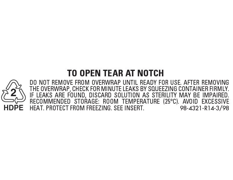 This text seems to be instructions for opening and handling a container with a solution. It is advised not to remove the overwrap until ready for use, and then after removing it, to check for any leaks. If leaks are found, the solution should be discarded. Storage temperature should be at room temperature (25°C). The container should be protected from excessive heat and freezing. There is also an insert to refer to for further information.*