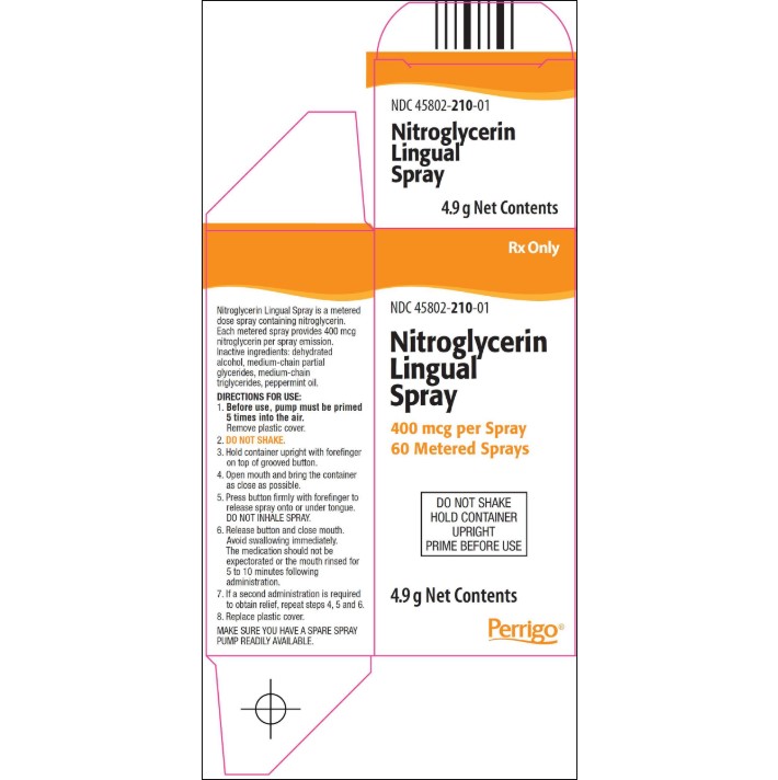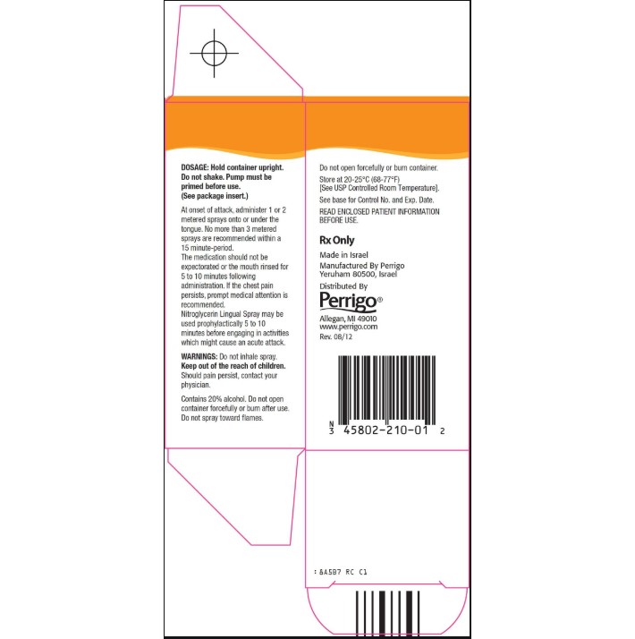 This is a description of Nitroglycerin Lingual Spray. It contains 400 mcg per spray with a total of 60 metered sprays and a net content of 49g. The pump must be primed before use and the package insert should be consulted for complete information. It should be stored at a temperature between 20-25°C (68-77°F) and kept out of reach of children. The manufacturer is Perrigo and it is distributed by Perrigo® in Allegan, MI.*