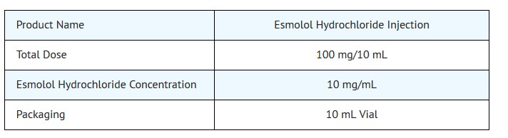 The product is Esmolol Hydrochloride Injection which comes in a 10 mL vial with a total dose of 100 mg/10 mL and a concentration of 10 mg/mL.*
