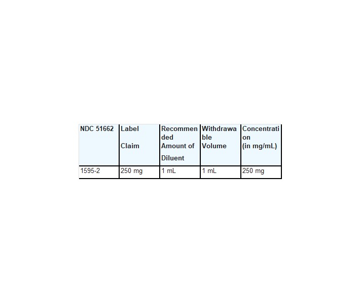 This appears to be a medication label with NDC (National Drug Code) number 51662. The medication may be recommended for use but there is information missing about any potential withdrawal of the medication. The medication is concentrated and is available in a volume of 250mg per mL, requiring a diluent. There is reference to a claim, but details are not available.*