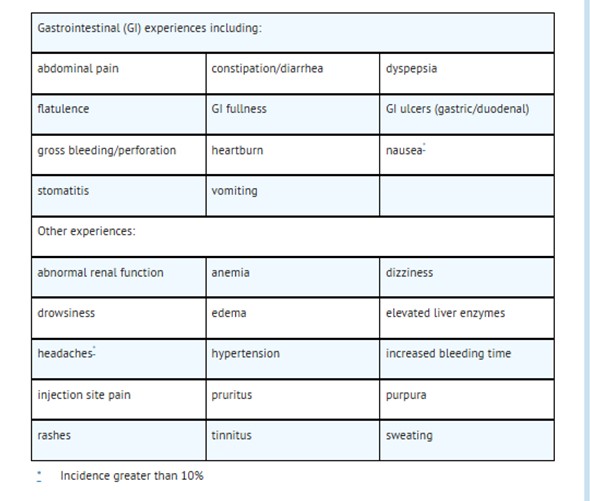 This text provides a list of gastrointestinal experiences and other potential side effects associated with a certain condition or medication. The gastrointestinal symptoms mentioned include abdominal pain, constipation, diarrhea, dyspepsia, flatulence, fullness, ulcers, gross bleeding, perforation, heartburn, nausea, stomatitis, and vomiting. Additionally, other experiences listed involve abnormal renal function, anemia, dizziness, drowsiness, eczema, elevated liver enzymes, headaches, hypertension, increased bleeding time, injection site pain, pruritus, purpura, rashes, tinnitus, and sweating. The overall incidence of these side effects is reported to be greater than 10%.*