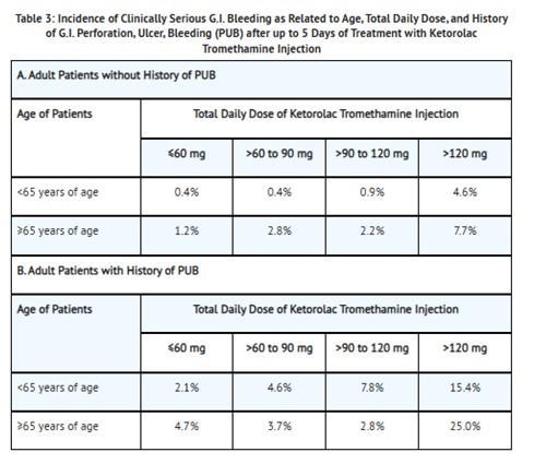 This is a table displaying the incidence of clinically serious bleeding in relation to age, total daily dose, and history of gastrointestinal bleeding after up to 5 days of treatment with Ketorolac Tromethamine Injection. The data is divided into two sections: one for adult patients without a history of gastrointestinal issues and another for adult patients with a history of gastrointestinal bleeding. The table provides percentages of bleeding incidents based on different age groups and total daily doses of the medication.*