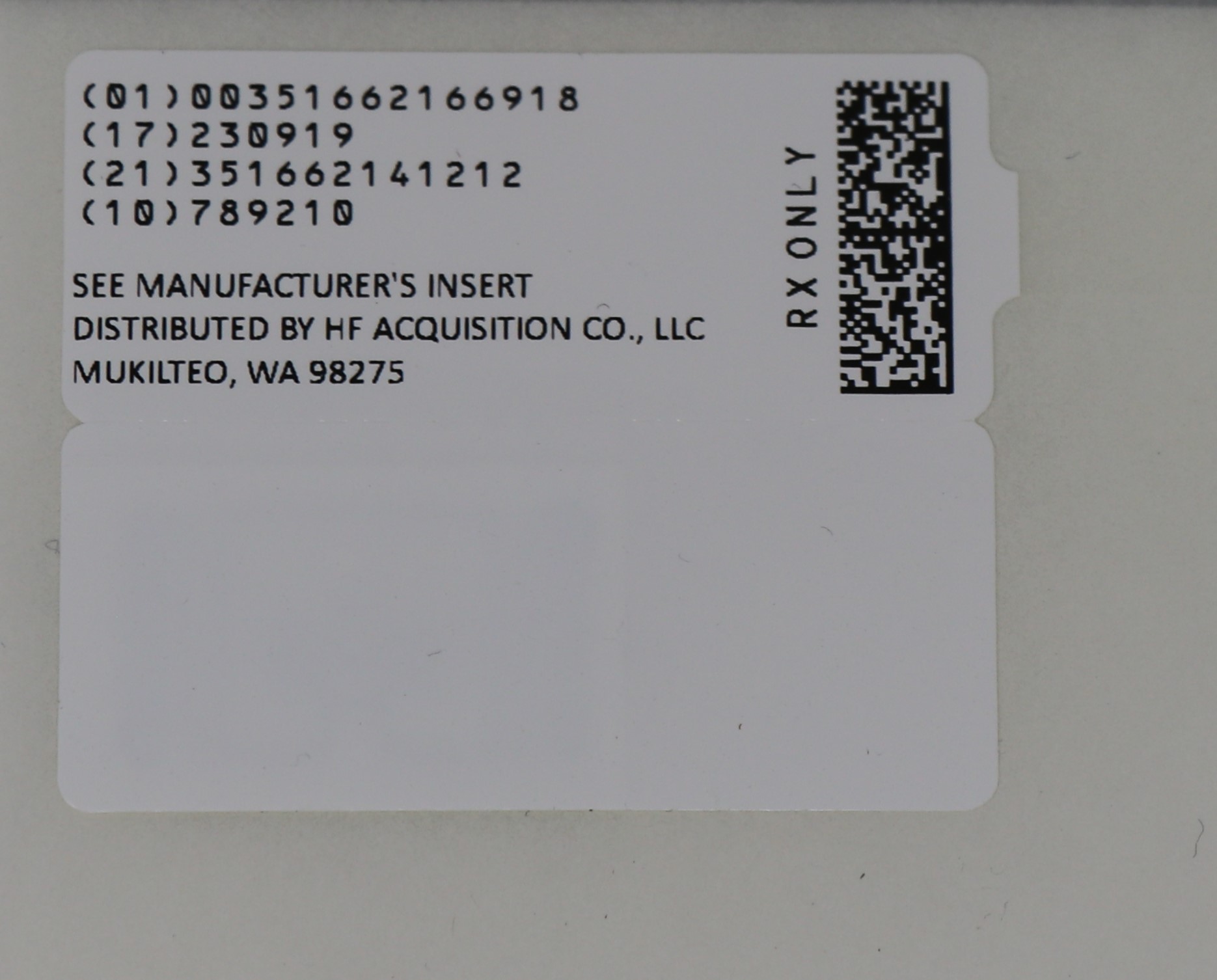 This text contains a series of identification numbers or codes, a mention of the manufacturer's insert, and information about the distributor HF Acquisition Co., LLC located in Mukilteo, WA 58275. It also mentions that the content is for prescription (Rx) use only.*