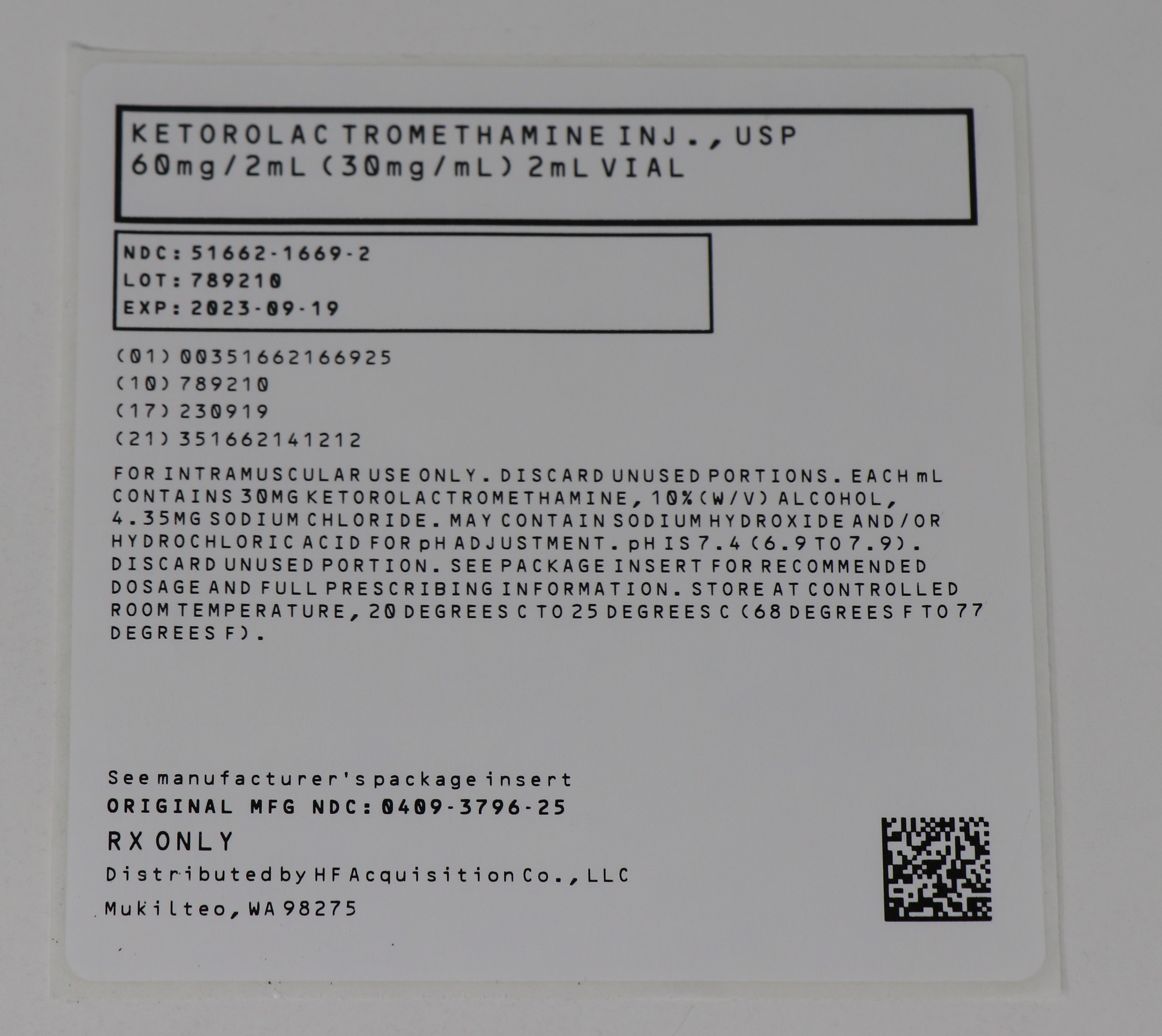This text provides information on Ketorolac Tromethamine injection, USP in a 60mg/2mL vial. The medication is for intramuscular use only and each mL contains 30mg of Ketorolac Tromethamine, along with 10% alcohol and 4.35mg of sodium chloride. The pH is adjusted to 7.4 and the vial should be discarded after use. The expiration date is 2023-89-19 and the lot number is 789218. The manufacturer's original NDC is 0409-3796-25. Recommended dosage and other prescribing information can be found in the package insert. The product should be stored at controlled room temperature. Distributed by HF Acgursitien e, LEC in Mukilteo, WA 98275.*