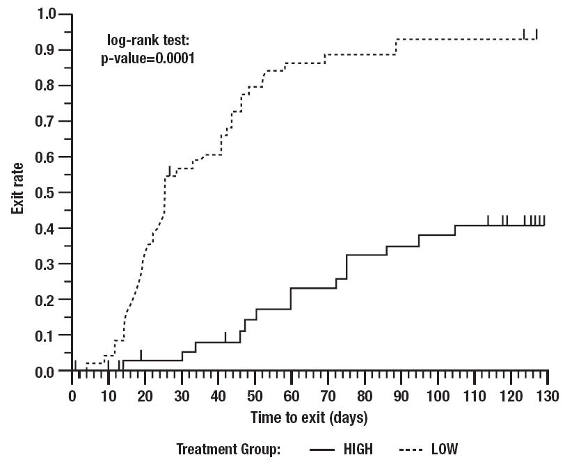 This is a survival analysis table showing time to exit (in days) for two groups: HIGH and LOW. The table also includes an exit rate of 0% and a log-rank test with a p-value of 0.0001. The treatment group is not specified except in the table title.*
