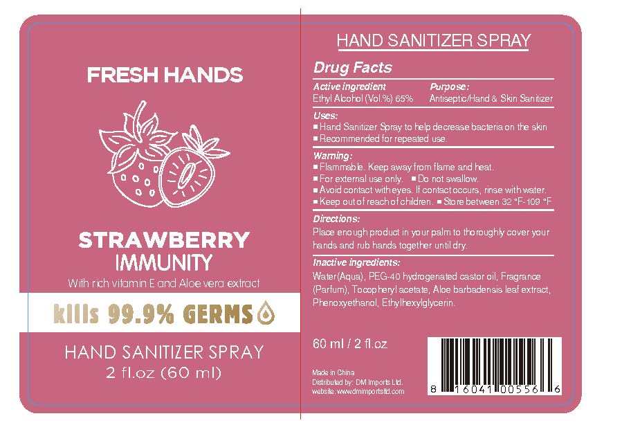 This is the description of a hand sanitizer spray called Fresh Hands. It has a Strawberry Immunity fragrance and contains vitamin E and Aloe vera extract. It claims to kill 99.9% germs and has the active ingredient Eifyl Abofol at 65% volume, which functions as an antiseptic and a hand and skin sanitizer. It is recommended for repeated use and must be kept between 32°F and 100°F. The inactive ingredients include water, PEG-40 hydrogenated castor oil, fragrance, tocopheryl acetate, Aloe barbadensis leaf extract, phenoxyethanol, and ethylhexylglycerin. The product must be used externally and must not be swallowed. The user should avoid contact with the eyes, and in case of contact, rinse with water. The packaging size is 2 fl.oz (60 ml).*