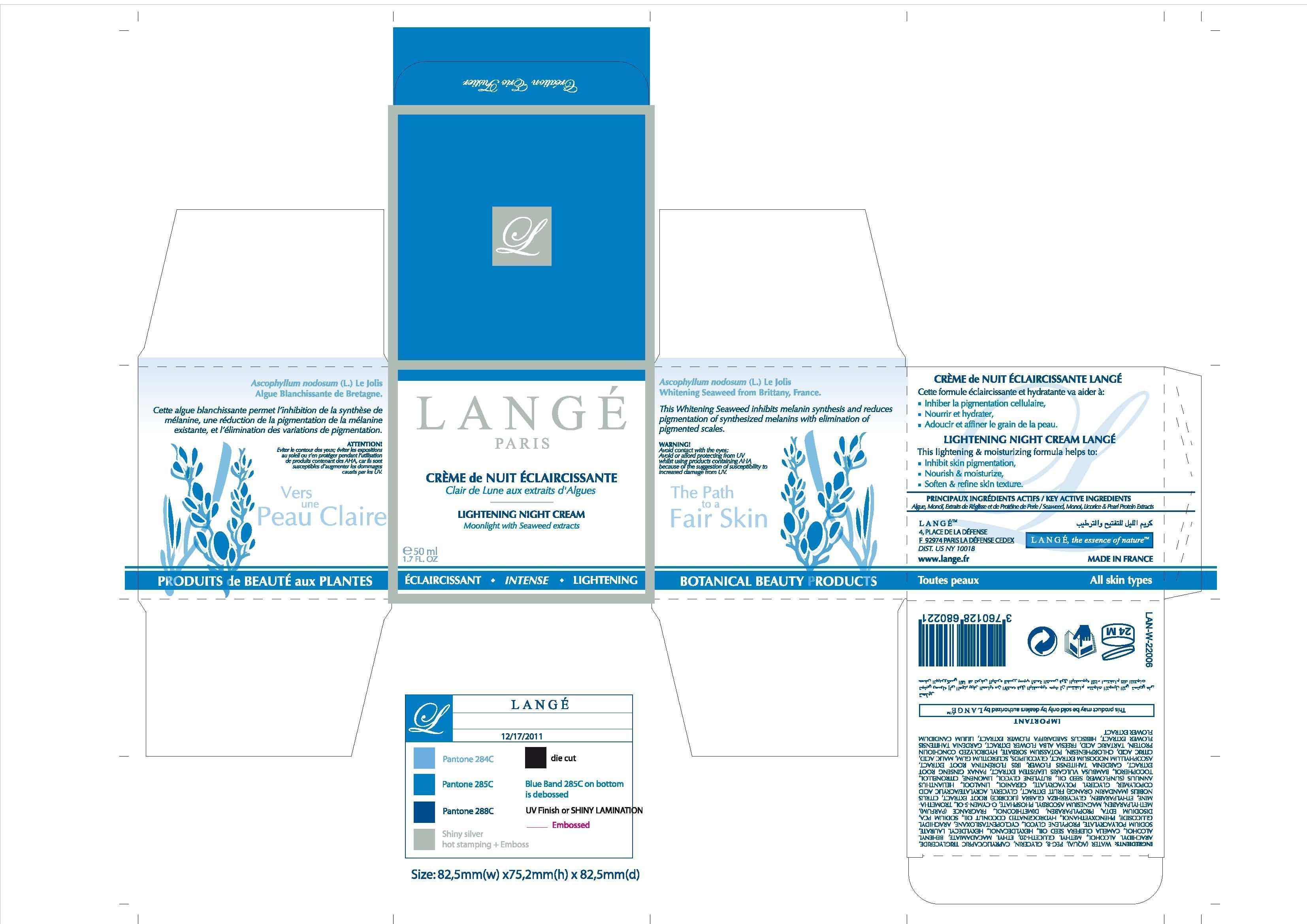 The following image provide visual information about the product associated with Lightening Night Cream NDC 51830-020 by Lange Sas, such as packaging, labeling, and the appearance of the drug itself. This resource could be helpful for medical professionals, pharmacists, and patients seeking to verify medication information and ensure they have the correct product.