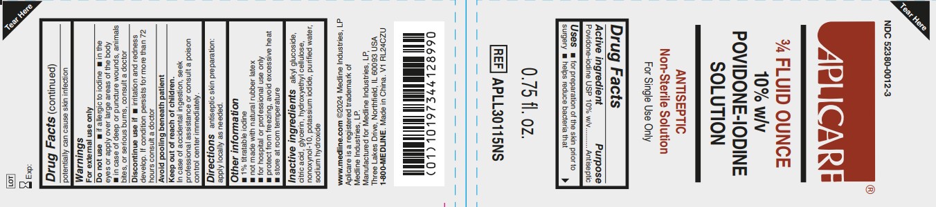 This text contains information about a Povidone-iodine solution labeled with NDC 52380-0012-3 as an antiseptic for single use. It has a concentration of 10% w/v. The solution is non-sterile and comes in a 0.751 fluid ounce bottle. The Drug Facts section mentions the active ingredient as Povidone-iodine USP. It provides guidelines for use and dosage, although some parts of the text are not clearly legible.*