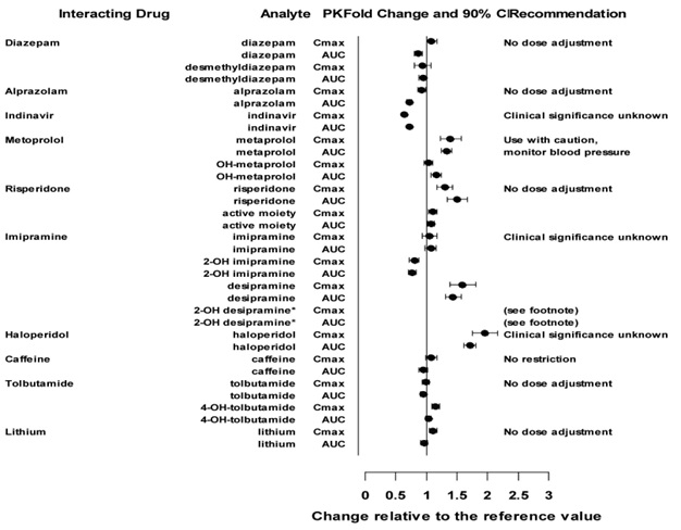 This text appears to be a drug interaction chart or table. It includes various drugs with their names, such as Atprazotam, Hatoperidol, Cattoine, and Litnium. The table also includes information about Analyte PKFold Change and 90%CiRecommendation, as well as recommendations on dose adjustment and clinical significance. However, the text is partial and does not provide enough context to generate a useful description.*
