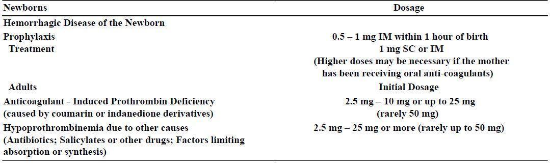 This text provides dosage information for the treatment and prevention of hemorrhagic disease in newborns and anticoagulant-induced prothrombin deficiency in adults. The recommended dosages range from 0.5-1mg for newborns and 2.5-25mg for adults, depending on the cause of hypoprothrombinemia. Higher doses may be necessary in some cases. The text also mentions factors that may limit the absorption or synthesis of antibiotics and salicylates.*