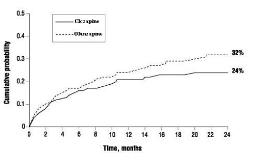 The probability of experiencing (1) a significant suicide attempt, including a completed suicide, or (2) hospitalization because of imminent suicide risk, including increased level of surveillance for suicidality for patients already hospitalized, was lower for clozapine patients than for olanzapine patients at Week 104: clozapine 24% versus olanzapine 32%; 95% CI of the difference: 2%, 14% (Figure 1).