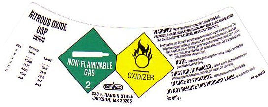 WARNING: HIGH PRESSURE OXIDIZING LIQUID AND GAS VIGOROUSLY ACCELERATES COMBUSTION CAN CAUSE RAPID SUFFOCATION CAN CAUSE ANESTHETIC EFFECTS MAY CAUSE FROSTBITE Avoid breathing gas. Store and use with adequate ventilation Keep oil and grease away Use only with equipment cleaned for nitrous oxide service and rated for cylinder pressure Do not get liquid in eyes, on skin, or clothing. Cylinder temperature should not exceed 52 C (125 F) Open valve slowly Close valve when not in use and when empty. Use in accordance with (refer to acceptable safety literature).
