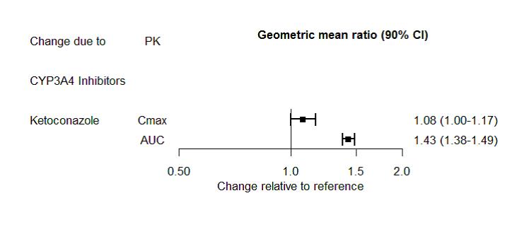This text appears to display data related to the impact of CYP3A4 inhibitors on the maximum concentration (Cmax) of Ketoconazole. It includes geometric mean ratios for the change relative to a reference, with corresponding confidence intervals.*