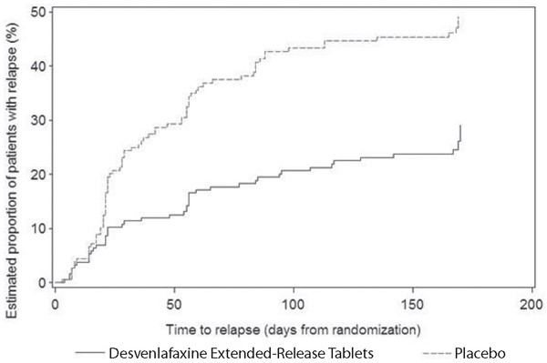 This text appears to be a graph showing the estimated proportion of patients experiencing a relapse over time (in days from randomization) for Desvenlafaxine Extended-Release Tablets 50 mg and Placebo. The y-axis appears to show the percentage of patients experiencing a relapse, with values ranging from 0% to 50% and the x-axis appears to be the number of days from randomization, ranging from 0 to 200.*