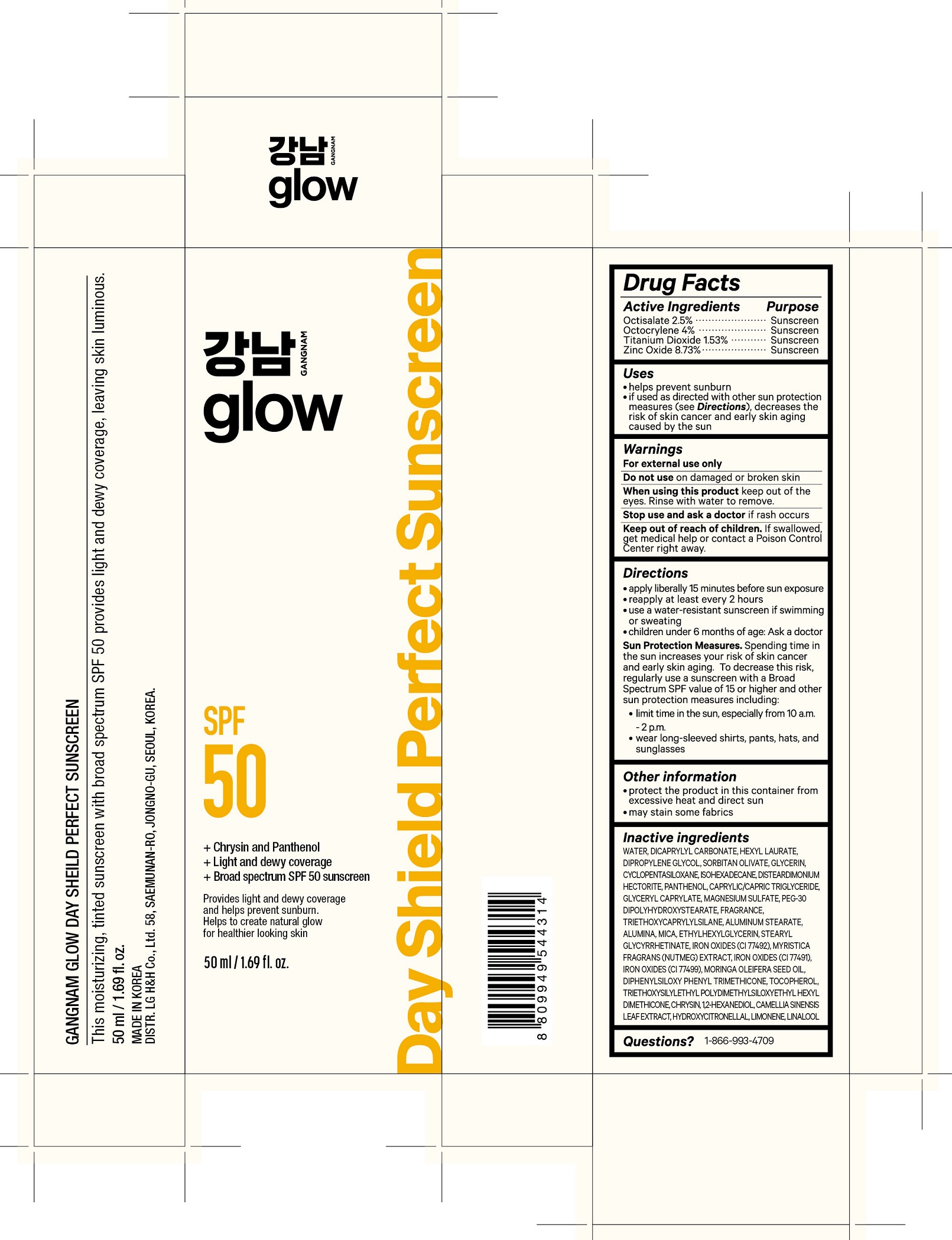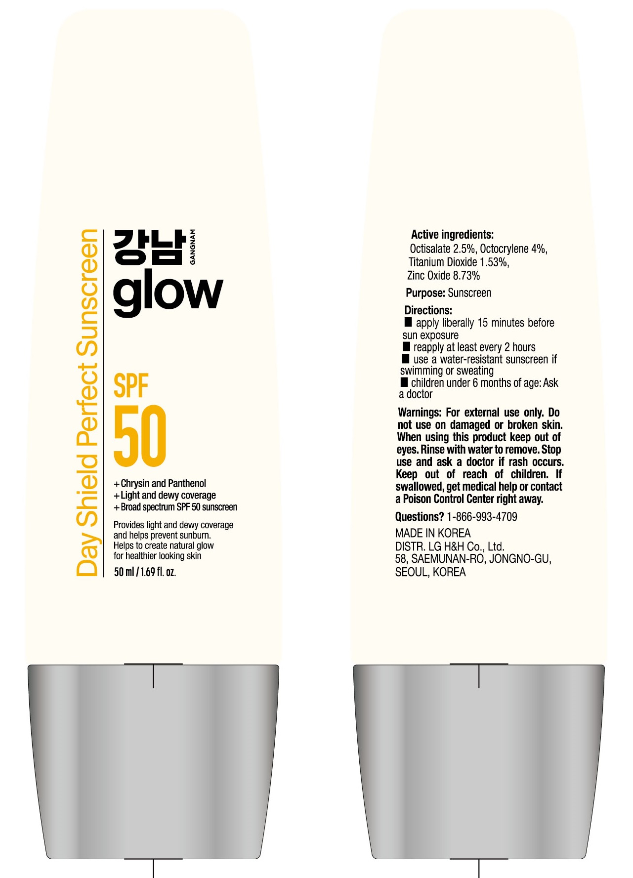 This text contains information about a tinted sunscreen from Korea called "GANGNAM GLOW DAY SHEILD PERFECT SUNSCREEN." It offers broad spectrum SPF 50 protection with light and dewy coverage, perfect for a natural glow. The formula includes Chrysin and Panthenol. The sunscreen contains active ingredients like Octisalate, Octocrylene, Titanium Dioxide, and Zinc Oxide. The directions, warnings, and usage guidelines are provided in the text, along with a list of inactive ingredients. The product is manufactured by LG H&H Co., Ltd. It comes in a 50ml/1.69fl oz container and is meant to leave the skin luminous and healthy-looking.*