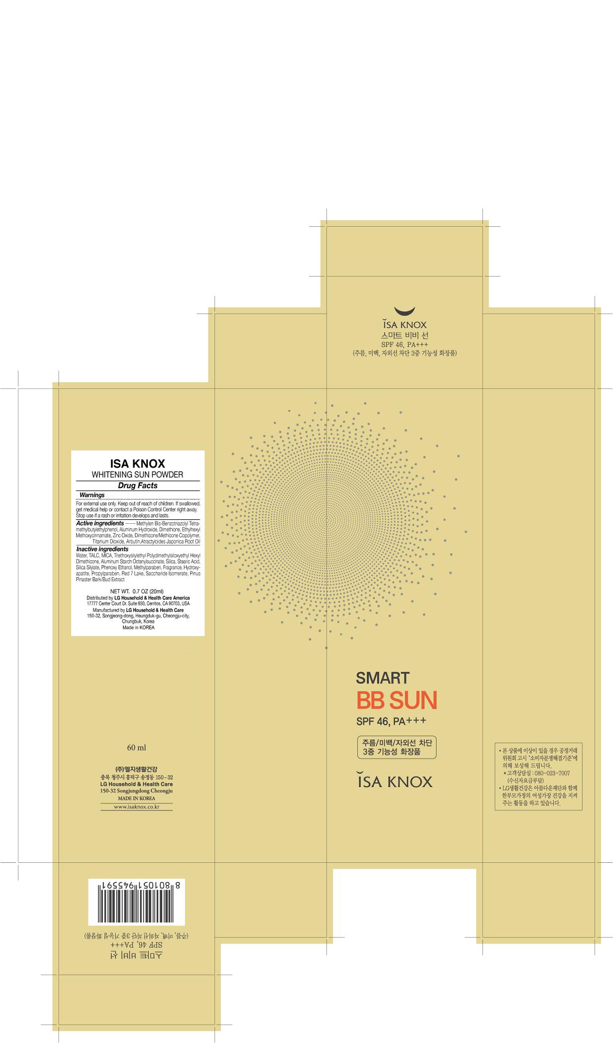 This is a product description for a whitening sun powder by ISA KNOX. The product is designed to protect the skin from the sun, and is made with a mix of active ingredients that include barzoyavaya oil and a range of chemicals. Other inactive ingredients in the product include talc and proylpuaben, among others. The net weight of the product is 0.7 ounces. The product is distributed by LG Household & HealthCare America, based in Casics, USA. The text indicates that the product is made in Korea.*