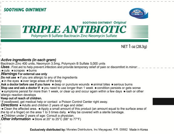 This is a description of a medication product called "Soothing Ointment Original". It is a triple antibiotic ointment containing the active ingredients of Polymyxin & Sulfate-Bacitracin Zinc-Neomycin Sulfate that helps to prevent infection and provide temporary relief of pain or discomfort in minor cuts, scrapes and burns. The product is for external use only, and the user should avoid large areas of the body and consult a doctor if they have deep or puncture wounds, animal bites or serious burns. The ointment can be applied to the affected area, and may be covered with a sterile bandage. This product is exclusively distributed by Morales Distributors, Inc.*