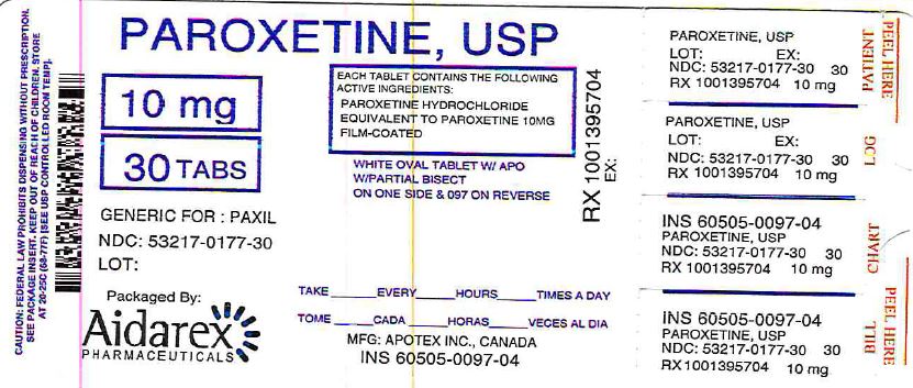 The following 2 images provide visual information about the product associated with Paroxetine NDC 53217-177 by Aidarex Pharmaceuticals Llc, such as packaging, labeling, and the appearance of the drug itself. This resource could be helpful for medical professionals, pharmacists, and patients seeking to verify medication information and ensure they have the correct product.