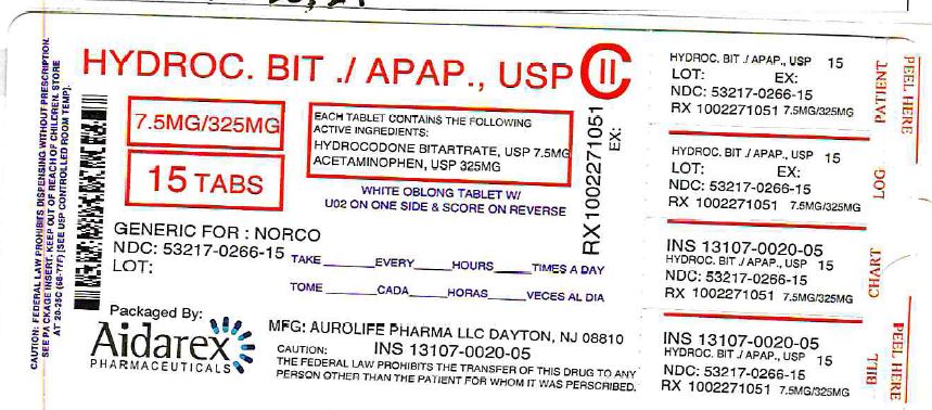 The following 5 images provide visual information about the product associated with Hydrocodone Bitartrate And Acetaminophen NDC 53217-266 by Aidarex Pharmaceuticals Llc, such as packaging, labeling, and the appearance of the drug itself. This resource could be helpful for medical professionals, pharmacists, and patients seeking to verify medication information and ensure they have the correct product.
