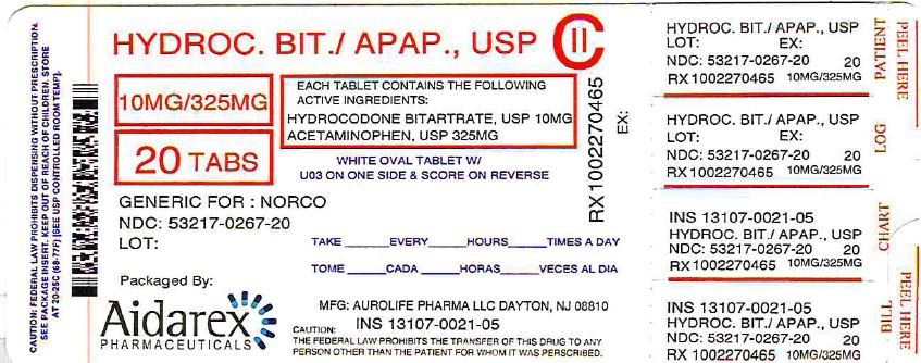 This is a medication package containing 20 tablets of Hydrocodone Bitartrate and Acetaminophen, USP 10mg/325mg. The tablet is generic for Norco and manufactured by Aurolife Pharma LLC. The lot number is not readable from the text. The package labeling warns that the federal law prohibits the transfer of the drug to any person other than the patient for whom it was prescribed. The package includes the National Drug Code (NDC) of 53217-0267-20 and the prescription number of RX 1002270465.*