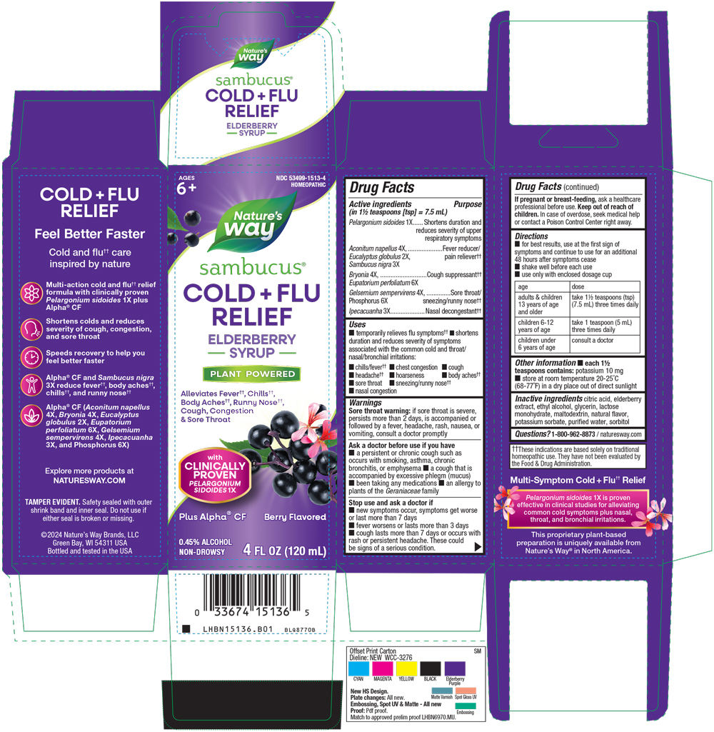 The following image provide visual information about the product associated with Sambucus Cold Flu Relief Elderberry NDC 53499-1513 by Schwabe North America, such as packaging, labeling, and the appearance of the drug itself. This resource could be helpful for medical professionals, pharmacists, and patients seeking to verify medication information and ensure they have the correct product.