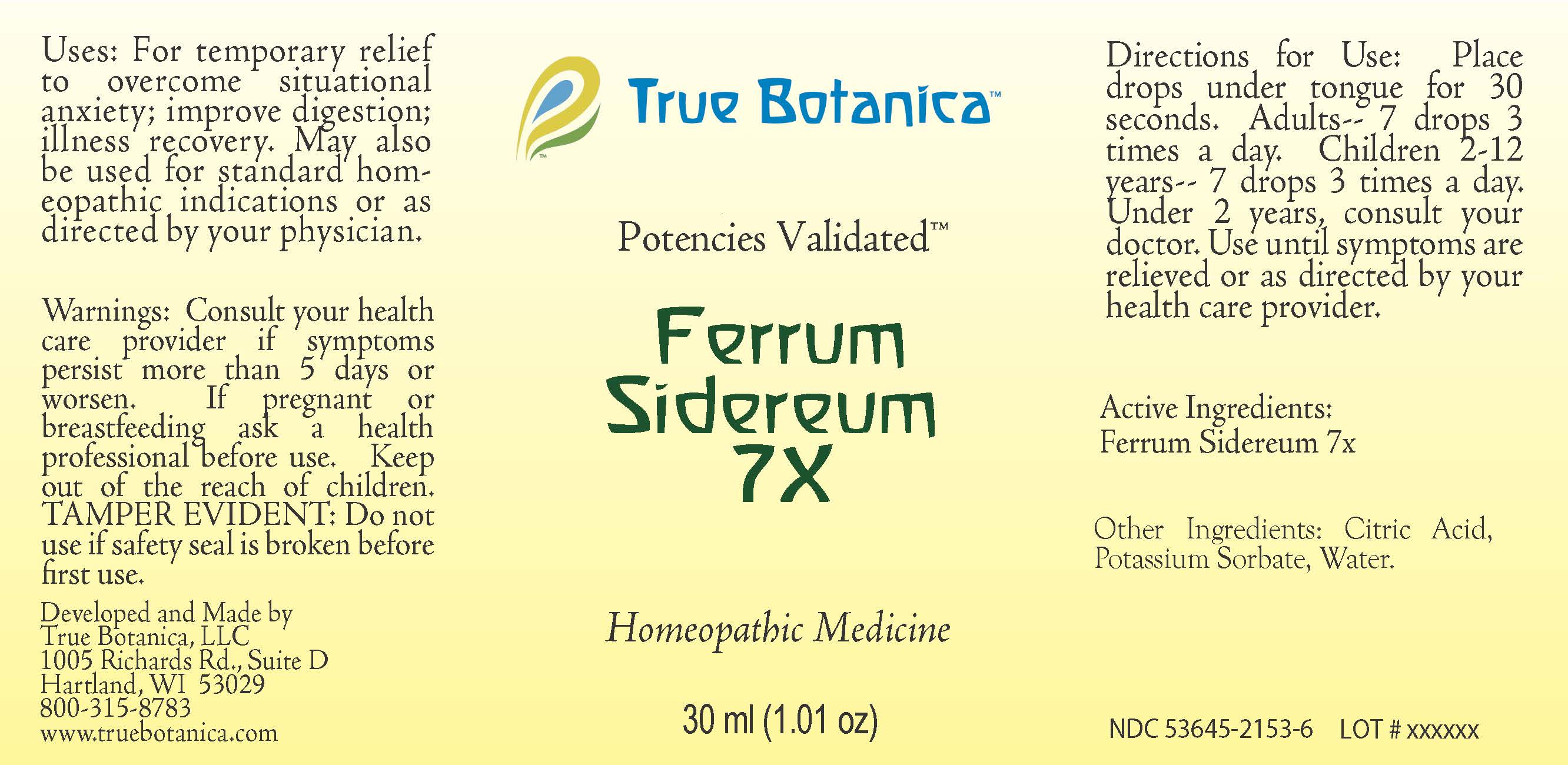 The following image provide visual information about the product associated with Ferrum Sidereum 7x NDC 53645-2153 by True Botanica, Llc, such as packaging, labeling, and the appearance of the drug itself. This resource could be helpful for medical professionals, pharmacists, and patients seeking to verify medication information and ensure they have the correct product.