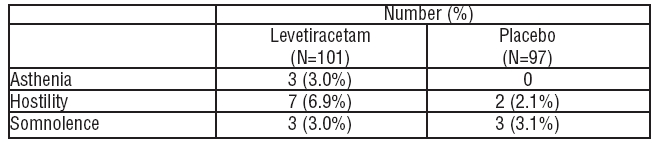 This appears to be a table comparing the incidence of adverse reactions between subjects treated with Levetiracetam and those treated with placebo. The adverse effects reported include asthenia, hostility, and somnolence. The numbers in parentheses denote the percentage of subjects in the placebo group who experienced each reaction.*
