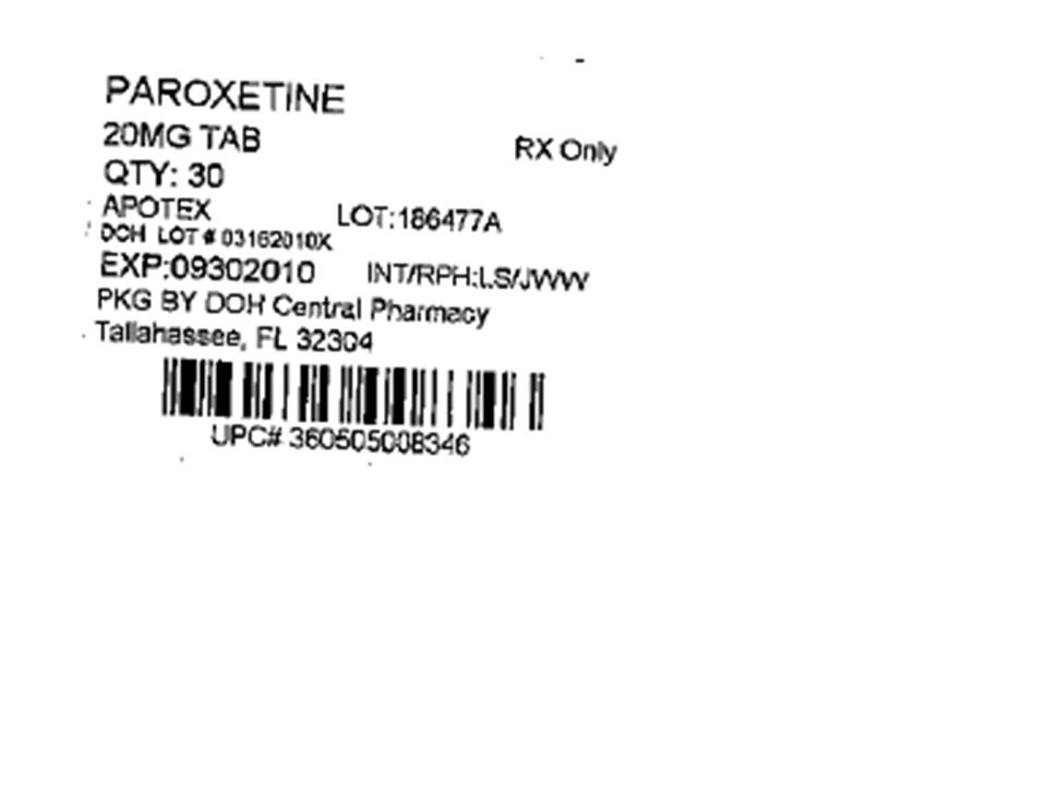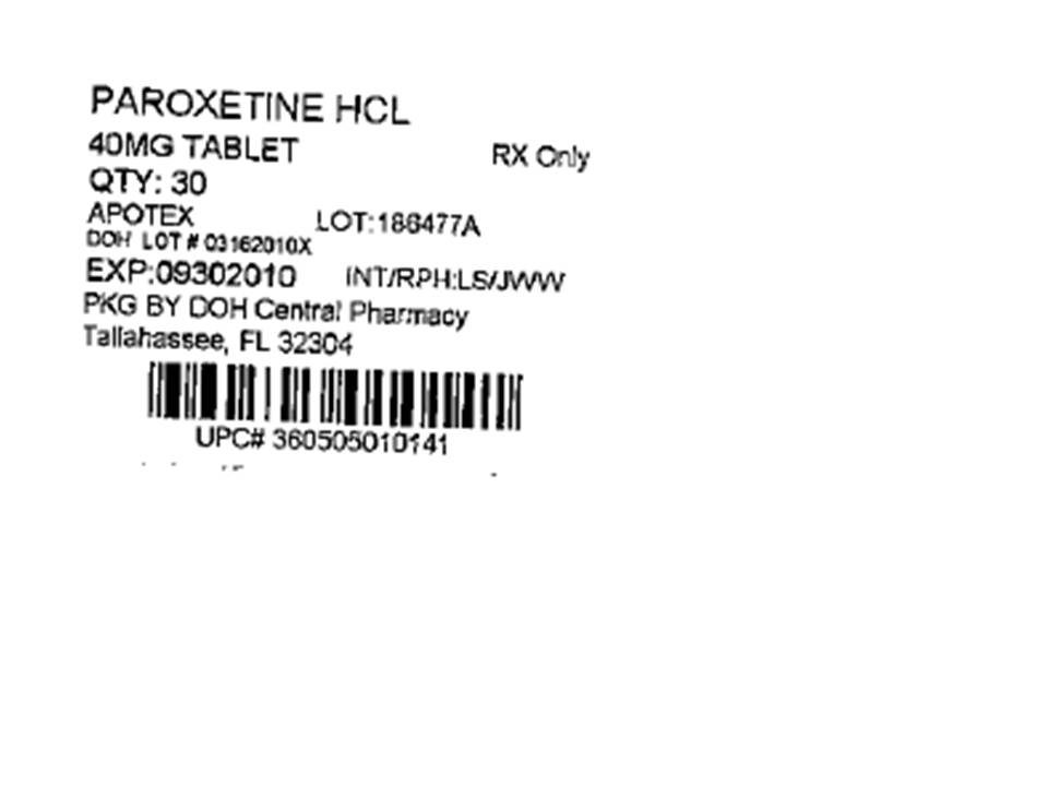 This is a description of a prescription medication called Paroxetine HCL, which comes in the form of a 40mg tablet. The bottle contains 30 tablets and it is only available with a prescription. It was produced by Apotex, and the lot number is 188477A. The DO LOT number is ¥ 03162010 and it expires on 09/30/2010. It was packaged by DOH Central Pharmacy in Tallahassee, FL.*