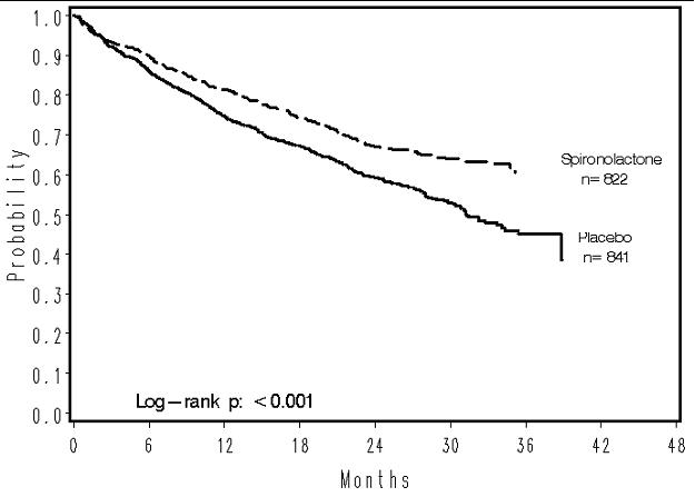 The primary endpoint for the Randomized Spironolactone Evaluation Study was time to all-cause mortality. The study was terminated early, after a mean follow-up of 24 months, because of significant mortality benefit detected on a planned interim analysis. The survival curves by treatment group are shown in Figure 1.