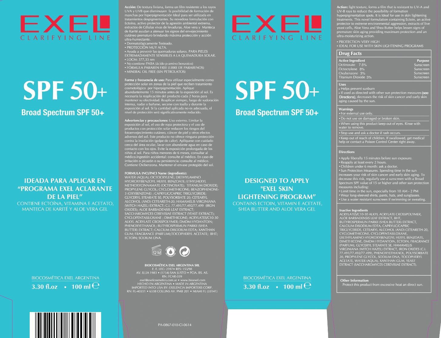 This is a product by Biocosmetica Exel Argentina that is a broad-spectrum SPF 50+ designed for use with Exel Skin Lightening Program. It contains ingredients such as Ectoine, Vitamin E Acetate, Shea Butter, and Aloe Vera Gel. It is a light-textured product that reduces the formation of hyperpigmentation spots due to its resistance to UVA and UVB rays. The novel formulation helps reduce premature skin aging by providing maximum protection and moisture. This sunscreen is high in protection and free of PABA, Parabens, and Petrolatum. It should be applied 15 minutes before sun exposure and reapplied every two hours for maximum effectiveness. It also contains instructions to limit exposure to the sun, including wearing protective clothing and avoiding prolonged exposure to the sun.*