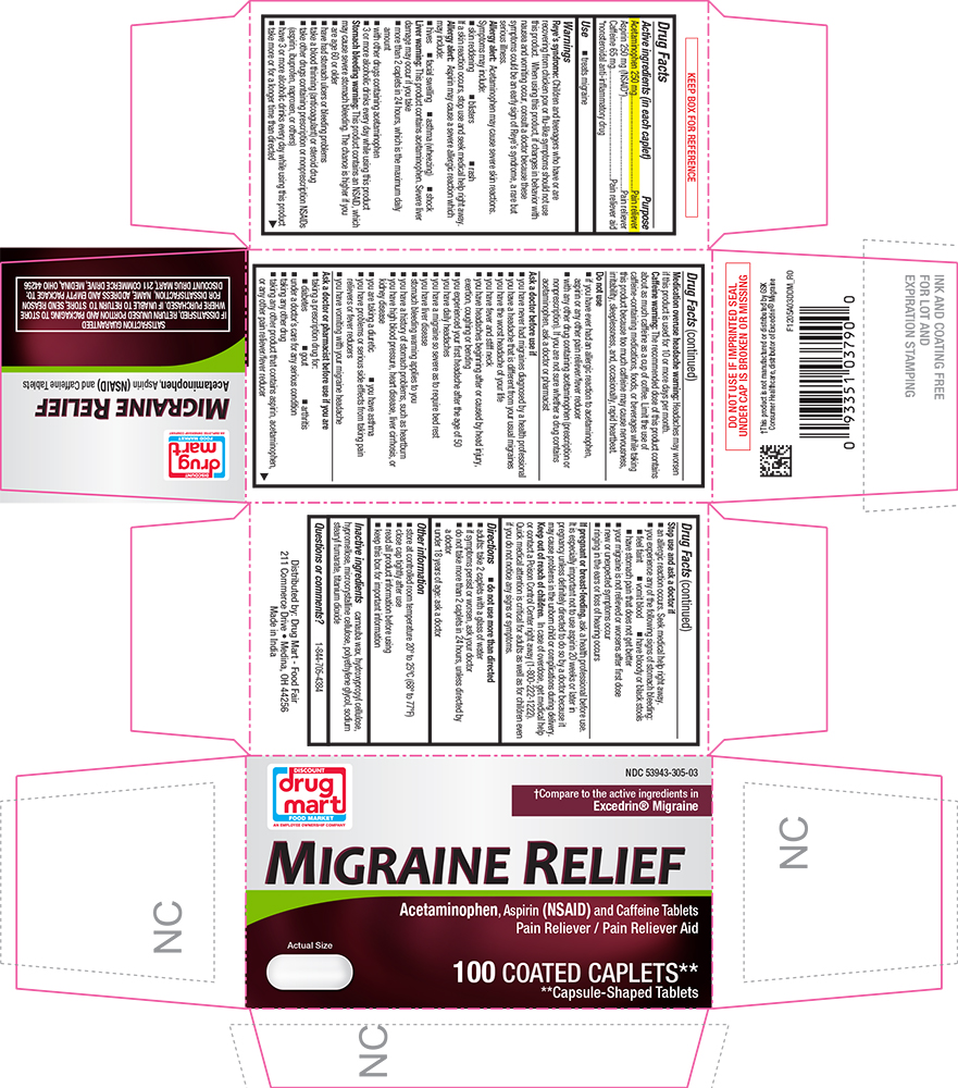 The following image provide visual information about the product associated with Migraine Relief NDC 53943-305 by Discount Drug Mart, such as packaging, labeling, and the appearance of the drug itself. This resource could be helpful for medical professionals, pharmacists, and patients seeking to verify medication information and ensure they have the correct product.