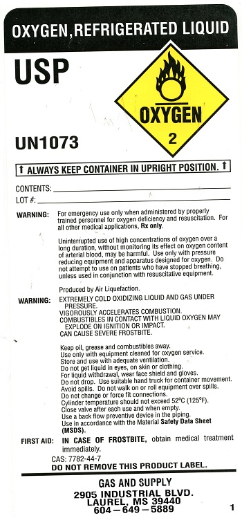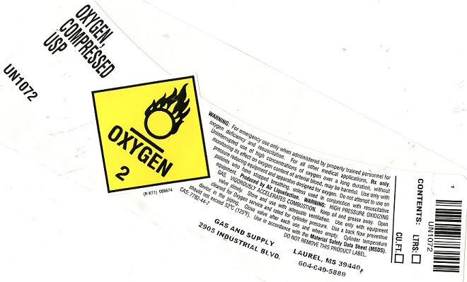 This is a description of compressed oxygen available at a gas and supply company located at 2005 Industrial Blvd. Laurel, MS 39440. The oxygen is classified as UN 1072, and comes in three sizes: 170 Liters, 248 Liters, and 415 Liters. The reference code OH 6910 is also mentioned.*