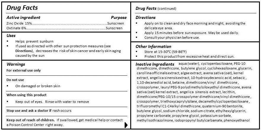 This is a Drug Facts label that provides information on the active and inactive ingredients, uses, directions, warnings, and other important facts about a sunscreen product. The product contains Zinc Oxide and Oxtinate as active ingredients to help prevent sunburn and decrease the risk of skin cancer and early skin aging caused by the sun. Users are advised to apply it to clean and dry face morning and night, 15 minutes before sun exposure, and to consult a physician before use. The sunscreen should be stored at 15-30°C and protected from excessive heat and direct sun. The label warns against using it on damaged or broken skin, keeping it out of eyes, stopping use if a rash occurs, and keeping it out of reach of children.*