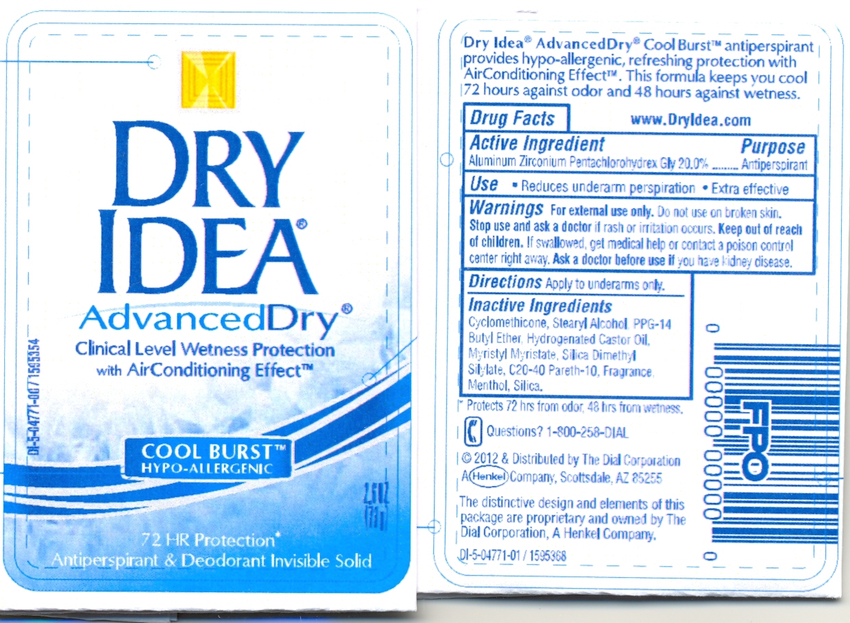 Dry Idea Advanced provides clinical-level wetness protection with hypoallergenic and refreshing protection against odor. It provides an Air-Conditioning Effectâ„¢ that keeps you cool and dry for up to 72 hours. This antiperspirant comes in Cool Burstâ„¢ and is designed for external use only. It contains aluminum zirconium pentachlorohydrex gly and other inactive ingredients such as cyclomethicone and stearyl alcohol. This product includes warnings to keep out of reach of children and to stop use if a rash occurs. It is distributed by The Aramis Company and is a proprietary design of The Dial Corporation, A Henkel Company. Visit the Dry Idea website for more information.*
