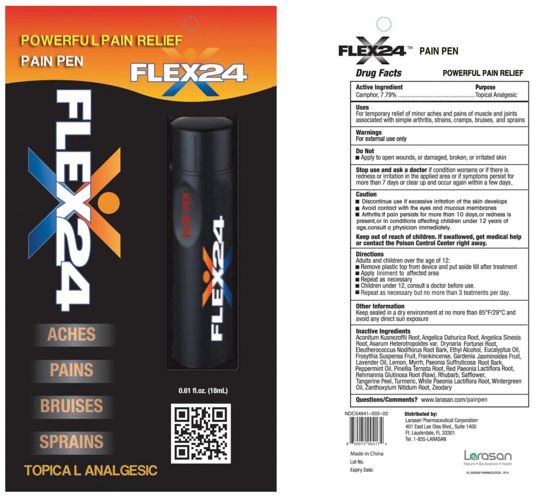The following image provide visual information about the product associated with Flex24 Pain Pen NDC 54641-003 by Larasan Pharmaceutical Corporation, such as packaging, labeling, and the appearance of the drug itself. This resource could be helpful for medical professionals, pharmacists, and patients seeking to verify medication information and ensure they have the correct product.