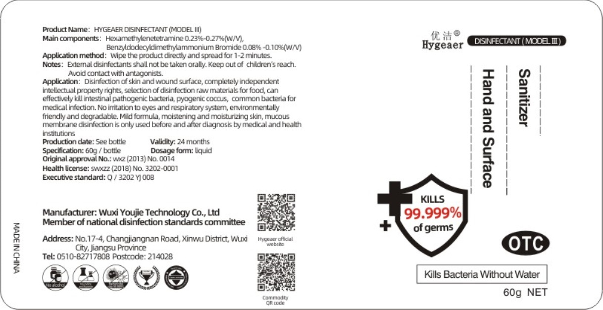 HYGEAER DISINFECTANT (MODEL II) is an external disinfectant manufactured by Wuxi Youjie Technology Co., Ltd, which has completely independent intellectual property rights. It is a disinfectant for the skin and the wound surface. The disinfectant raw materials are selected for food and can effectively kill intestinal pathogenic bacteria, pyogenic coccus and common bacteria for medical infection. The product is easy to use, and it is only used before and after diagnosis by medical and health institutions. It comes in a 60g bottle with a liquid dosage form. The main components are Hexamethylenetetramine and Benzyldodecyldimethylammonium Bromide. To apply, wipe the product directly and spread for 1-2 minutes. It is not available for oral consumption and should be kept out of children's reach. The product is environmentally friendly and biodegradable. The production date is specified on the bottle, and its validity is 24 months. The executive standard is Q/2202 Y) 008, and the original approval number is wz (2013) No. 0014.*