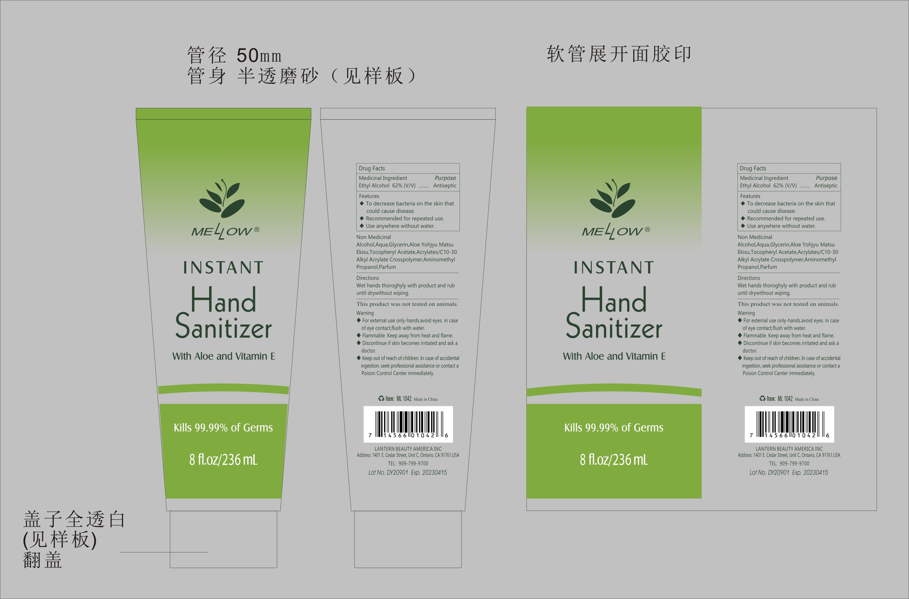 This is a hand sanitizer product with a 50mm measurement. It has an 8 fl.oz/236 mL bottle with Aloe and Vitamin E. It can kill 99.99% of germs and contains Ethyl Alcohol 62% (V/V) as an antiseptic. It should be used externally and away from eyes or flames. In case of accidental ingestion, seek professional assistance or contact a Poison Control Center immediately. This product was not tested on animals. The product was made in China and distributed by LANTERN BEAUTY AMERICANINC, located in Ontario, CA, USA.*