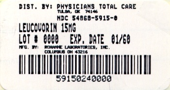This is a description of a medication called Leucovorin, distributed by Physicians Total Care. The medication comes in a bottle with a label including the LOT# 6000 and an expiration date of 61/60. The medication strength is 15 HG and has an NDC number of 54868-5915-8. The manufacturer is not specified. There is also a timestamp code of Ctme 01 4516.*